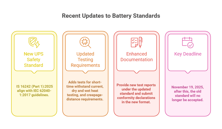 - New UPS Safety Standard:BIS just rolled out IS 16242 (Part 1):2025 last month, replacing their old 2014 standard. The new rules align with IEC 62040-1:2017 guidelines, bringing India’s battery standards up to current international benchmarks.