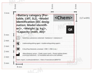 Using portable rechargeable, SLl, and LMT batteries as examples, the design specifications are illustrated below. These clearly define mandatory data fields, element positioning, symbol dimensions.