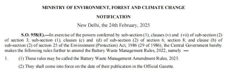 On February 24, 2025, the Ministry of Environment, Forest and Climate Change of India issued the 2025 amendment to the Battery Waste Management Rules. This